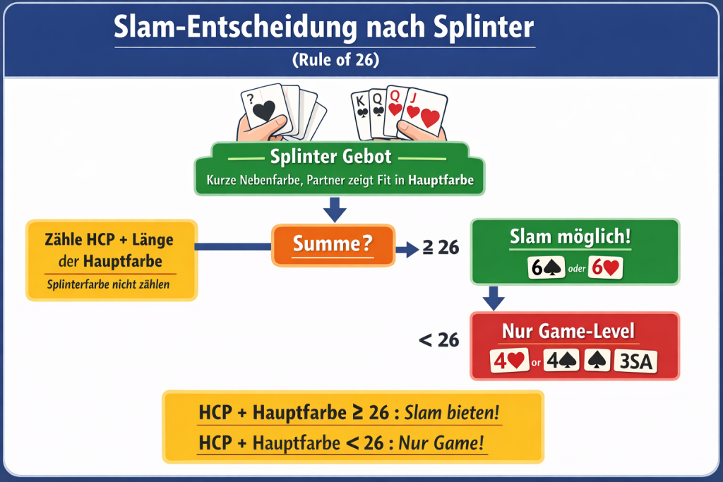 - Auf BBO: Splinter erkennen → HCP + Länge der unterstützten Farbe → Summe ≥26 → Slam-Level überlegen
